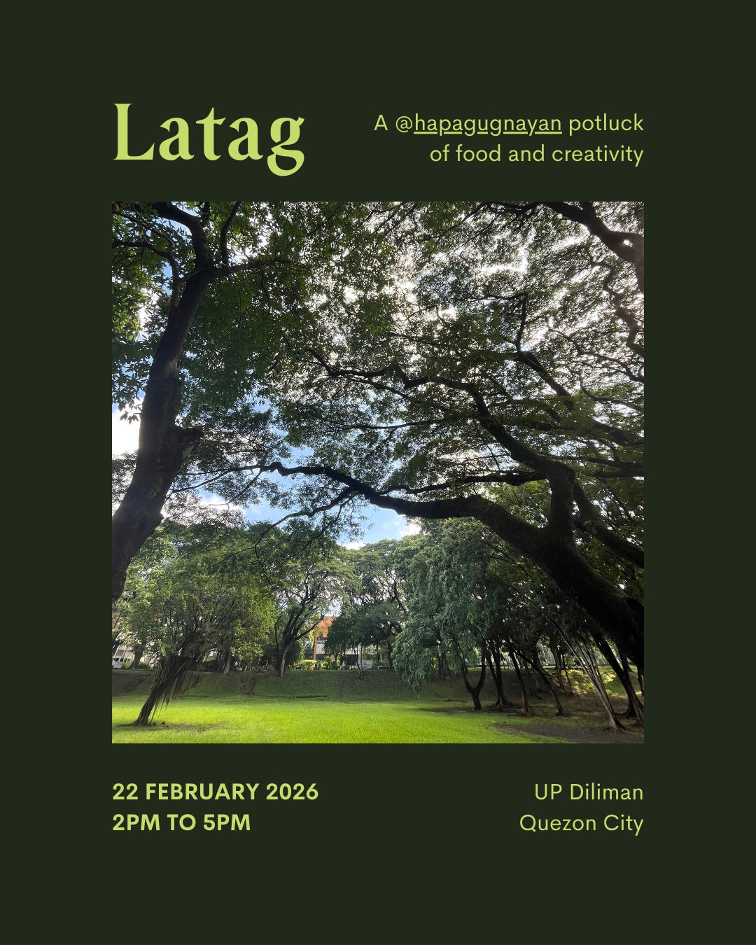 Hang out with @pagbubuo and @mabidavid of @hapagugnayan and @goodfoodcommunity beneath the trees for an afternoon of sharing merienda, stories and writing inspired by food, with reflection and conversation prompts from @ugnayancards (from/for our upcoming food-themed deck)! 😋